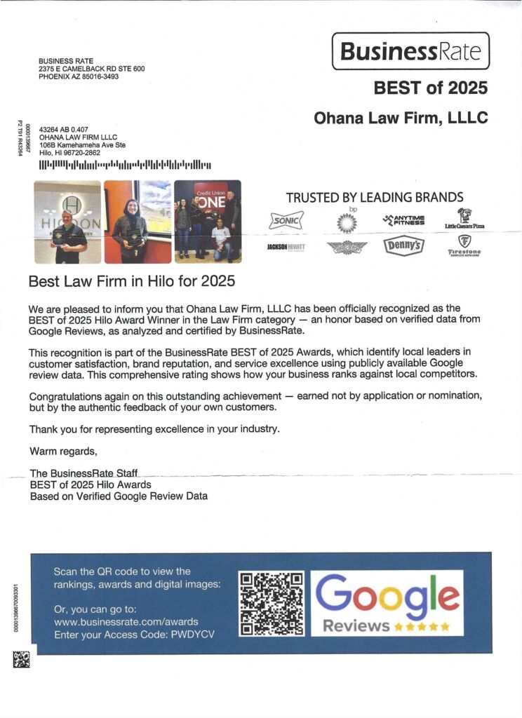 I have to say Ohana Law Firm is a lifesaver!!! We would not have gotten where we did as quickly as we did without their expertise, knowledge and creativity. They completely handled my case in less than 4 months… it easily could have been two plus years of court proceedings. Their honesty, patience and compassion for my situation was truly like I had my Ohana backing me up in this case. I highly recommend Ohana Law Firm for your case… as they will give your case the same care and consideration as they have shown My Ohana. Mahalo Ohana Law Firm and Aloha🌺🙏🏽🤙🏽